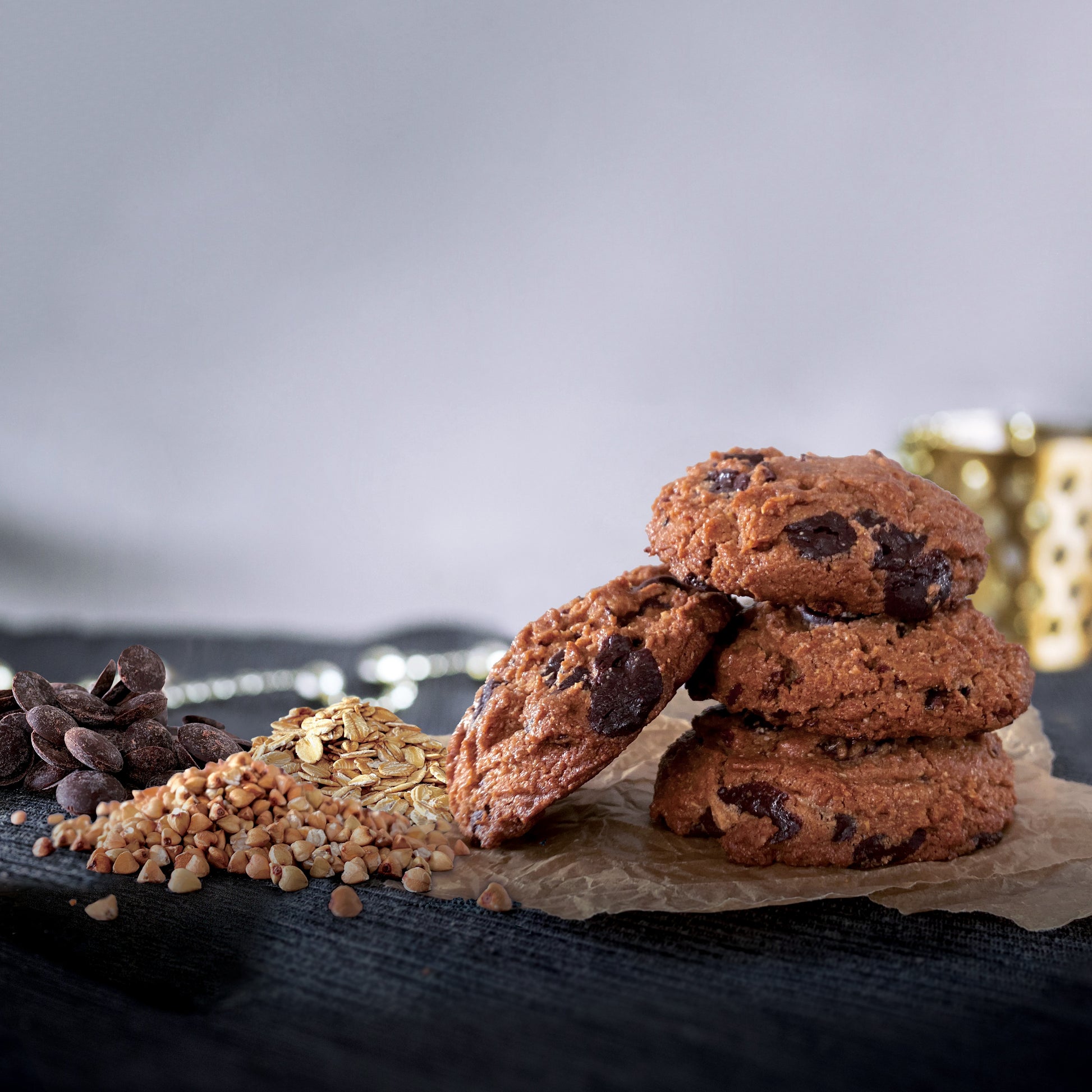 A universal crowd-pleaser and the best chocolate chip cookie you'll ever have - gluten-free or not! Filled with the goodness of oat and buckwheat and bursting with Callebaut Belgian dark chocolate and cacao nibs, this cookie is 100% free of allergens (nothing in bold!) but 200% full of flavour