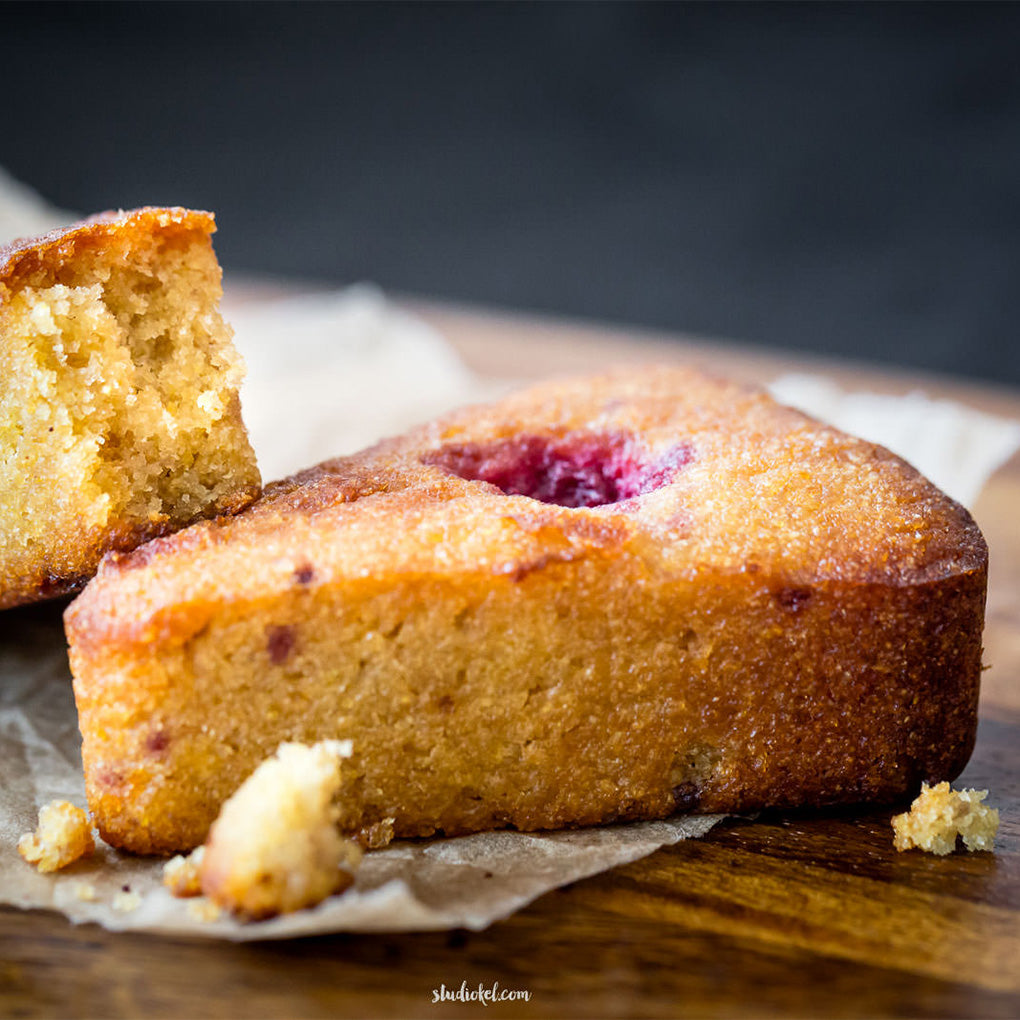 Unsweetened applesauce (apples, water ascorbic acid (vitamin C)), unrefined cane sugar, almonds, non-GMO polenta (cornmeal), olive oil, raspberries, lemons, GF baking powder, vanilla extract (propylene glycol; cobra vanilla beans extractives; water; glycerin), pink Himalayan salt